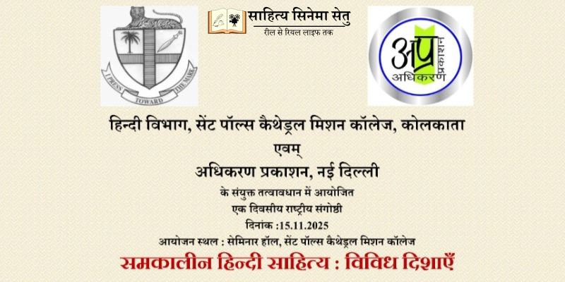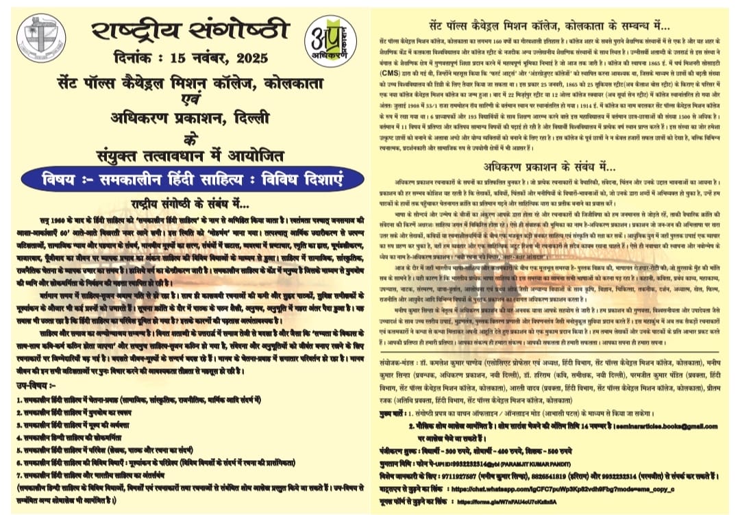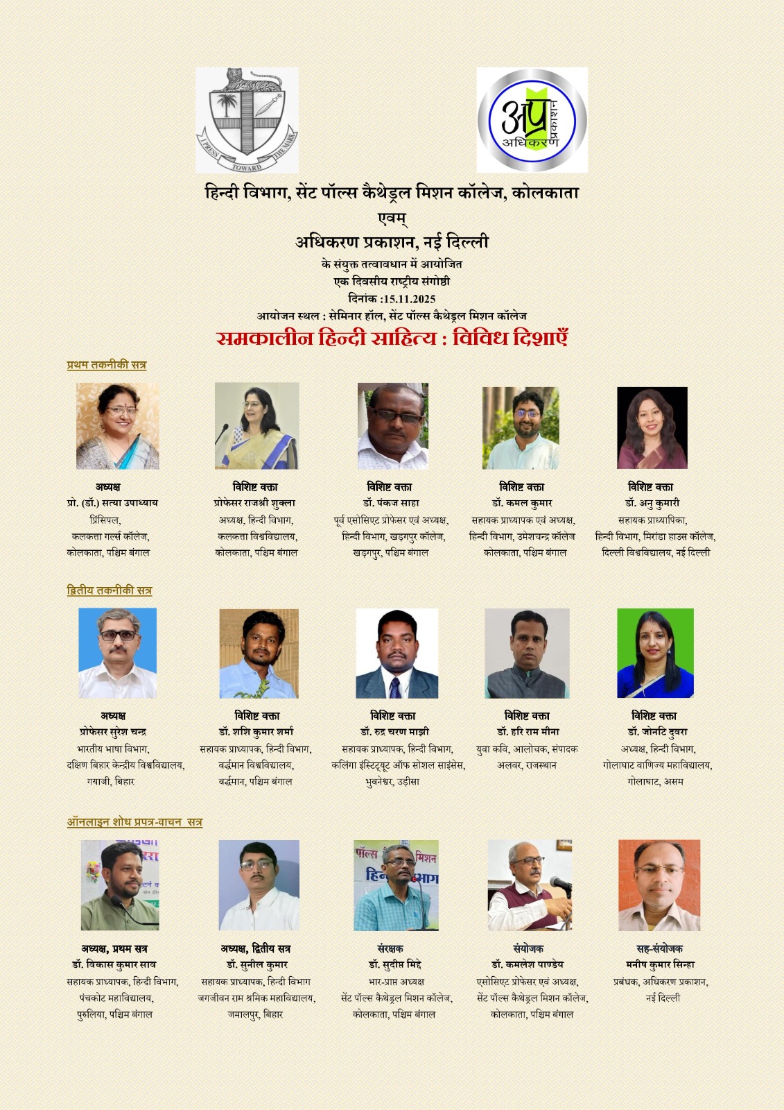हिंदी विभाग, सेंट पॉल्स कैथेड्रल मिशन कॉलेज, कोलकाता एवम् अधिकरण प्रकाशन, नई दिल्ली के संयुक्त तत्वावधान में एक दिवसीय राष्ट्रीय संगोष्ठी का आयोजन कोलकाता, पश्चिमी बंगाल में 15.11.2025 को किया जाएगा। “समकालीन हिंदी साहित्य : विविध दिशाएँ” विषय पर आयोजित इस एकदिवसीय राष्ट्रीय संगोष्ठी में प्रथम तकनीकी सत्र की अध्यक्षता प्रो.(डॉ.)सत्या उपाध्याय, प्रिंसिपल, कलकत्ता गर्ल्स कॉलेज, कोलकाता, पश्चिम बंगाल करेंगी।